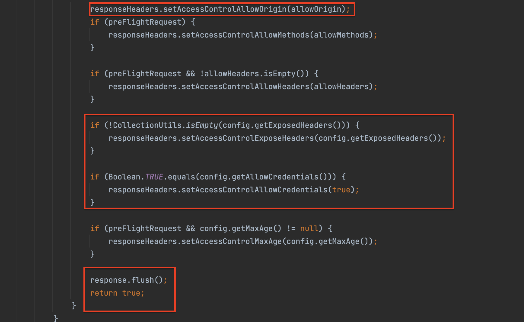 만약 CORS 설정 값이 있다면, CORS 정책에 위배되지 않는지 확인하고 허용 정보를 응답 헤더에 담는 로직이 수행된다.(예비 요청시 보내주는 정보는 제외) 이후 flush가 되며 응답이 보내지고 난 이후에 true를 통해서 다음 인터셉터가 수행되거나 핸들러가 수행되도록 한다.