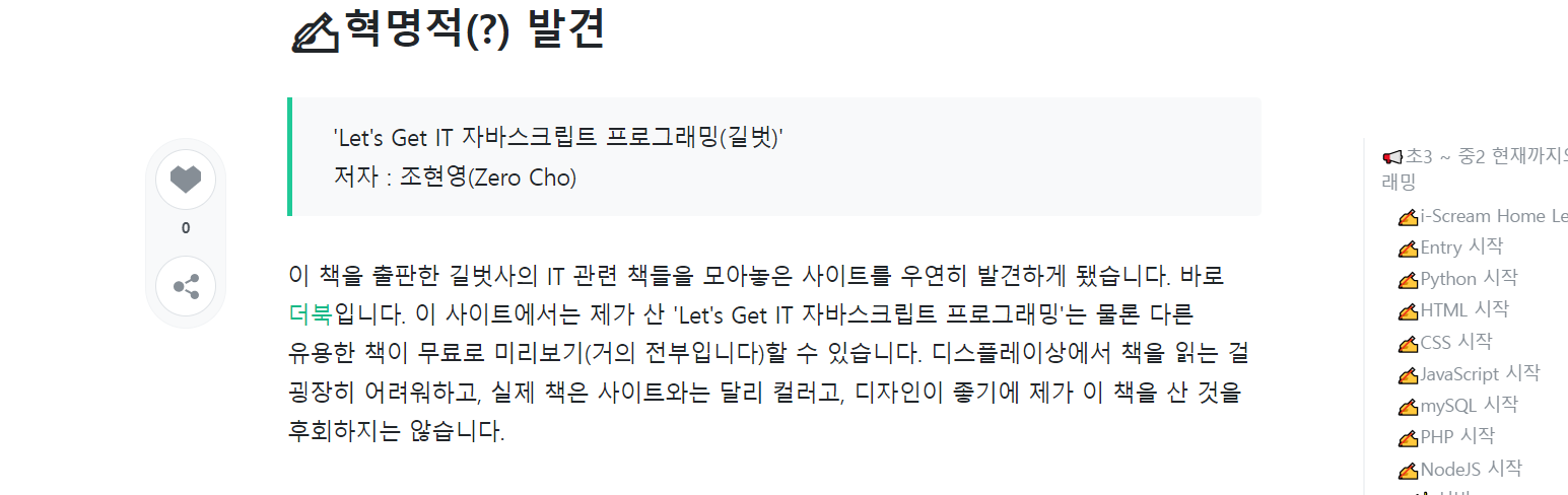 제가 위 글에서 썼던 것처럼 https://thebook.io/ 이 사이트에서 프로그래밍을 배우기도 합니다.
