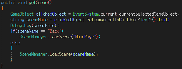 버튼을 누르면 해당 버튼의 Text 값을 읽어와 해당하는 Scene으로 넘겨주는 함수 입니다.