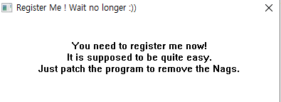 이번 문제는 registerMe.exe 파일을 patch 하여 Nag를 제거 하는 것입니다. 실행을 하면 다음과 같이