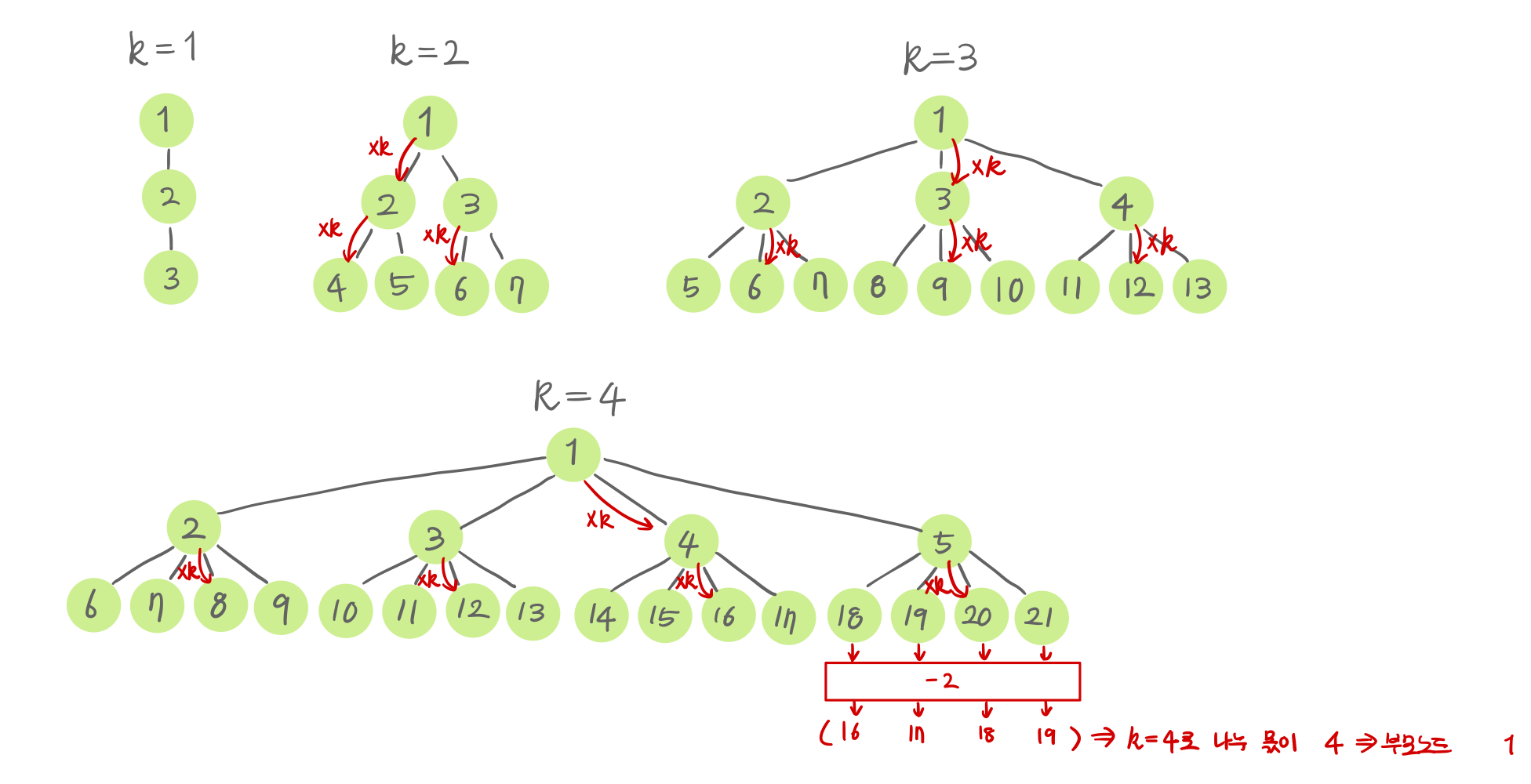 먼저 문제에서 설명한 K진 트리의 특성에 대해 이해해야한다.
