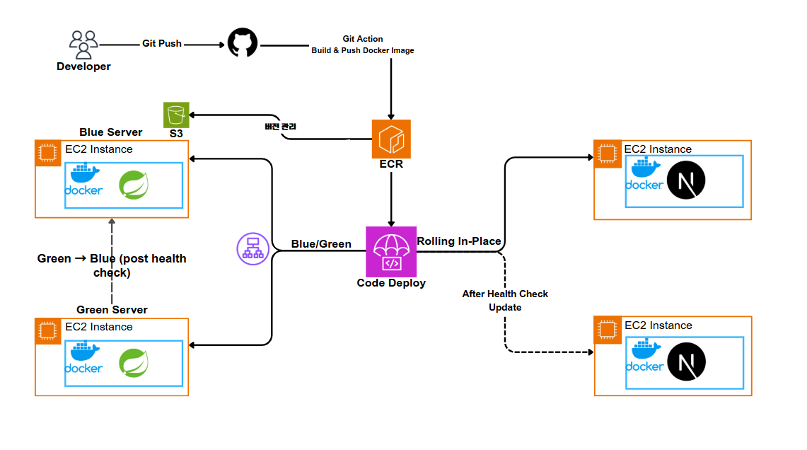 결국 지금은 GitHub Actions → ECR 푸시까지만 하고, EC2 쪽은 Code Deploy가ㅓ pull && up 해주는 방식이다.