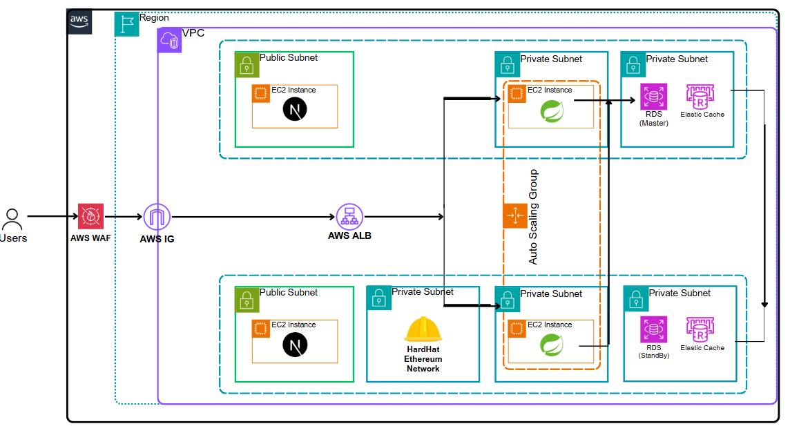 그래서 하드햇은 EC2 하나에서만 고정으로 띄우고, 컨트랙트를 배포하면 그 주소와 ABI를 서버에 POST로 전달하는 방식으로 바꿨다.