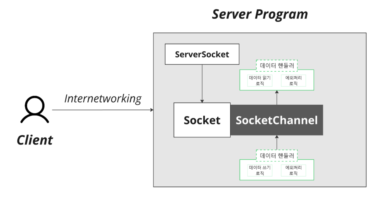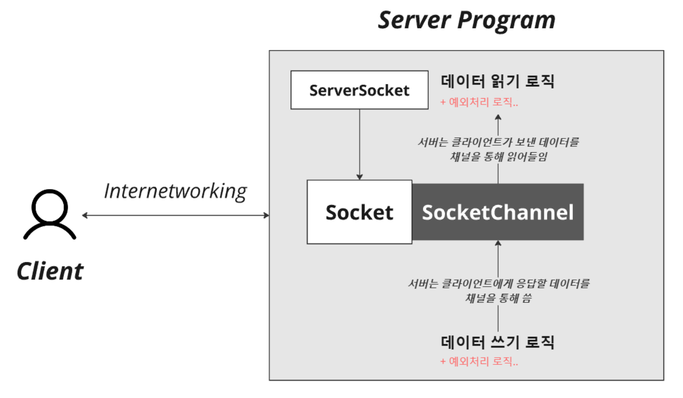 - java.nio와 다른점은 데이터 송/수신 로직과 예외처리 로직을 직접 작성해야한다.