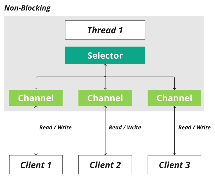 - 셀렉터의 이벤트와 이벤트 핸들러를 설정해두고, 클라이언트의 요청에 따라 발생하는 이벤트를 처리하는 형식으로 NonBlocking I/O를 지원함.
