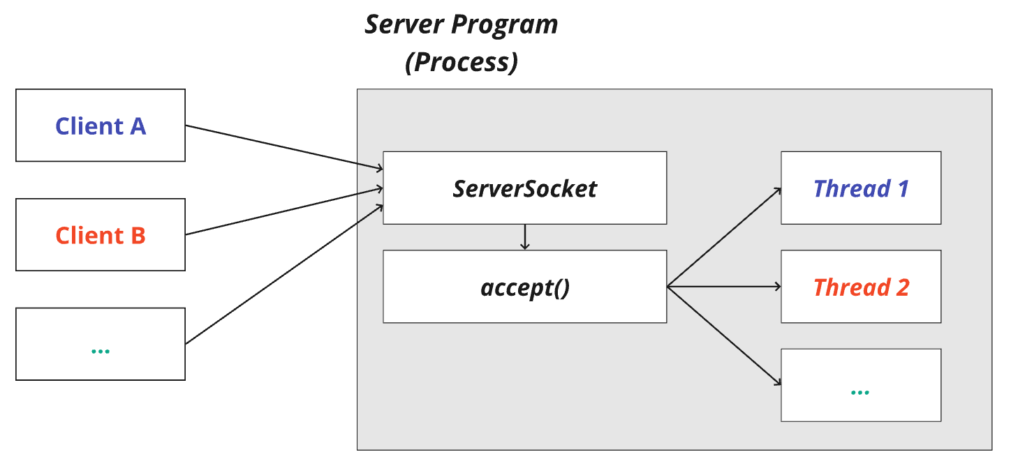 - 가장 단순한 서버--클라이언트의 연결을 살펴보면 서버는 클라이언트가 연결될 때까지 차단되고, 클라이언트가 요청이오면 해당 쓰레드는 클라이언트와 연결되어 추가 연결요청을 응답할 수 없음.