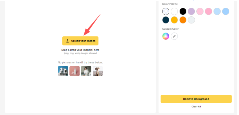 Click the Upload your images button to add your product photos. You can upload a single image in JPEG, PNG, or WebP format. The tool supports drag-and-drop functionality, making it easy to select images directly from your desktop or downloads folder. For sellers with multiple product shots, you can upload up to 20 images at once for batch processing.