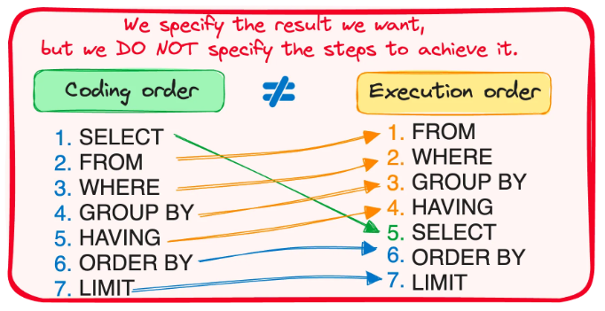 FROM → ON → JOIN → WHERE → GROUP BY → HAVING → SELECT → DISTINCT → ORDER BY → LIMIT