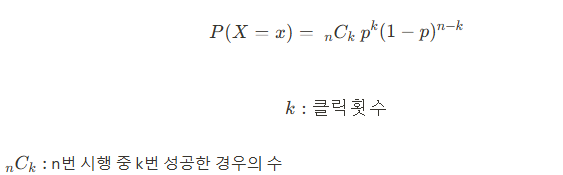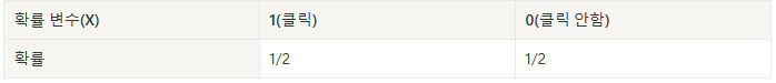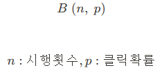 : 확률 변수가 취할 수 있는 경우가 2가지인 경우 ( ex:동전 던지기, 클릭 등 )
