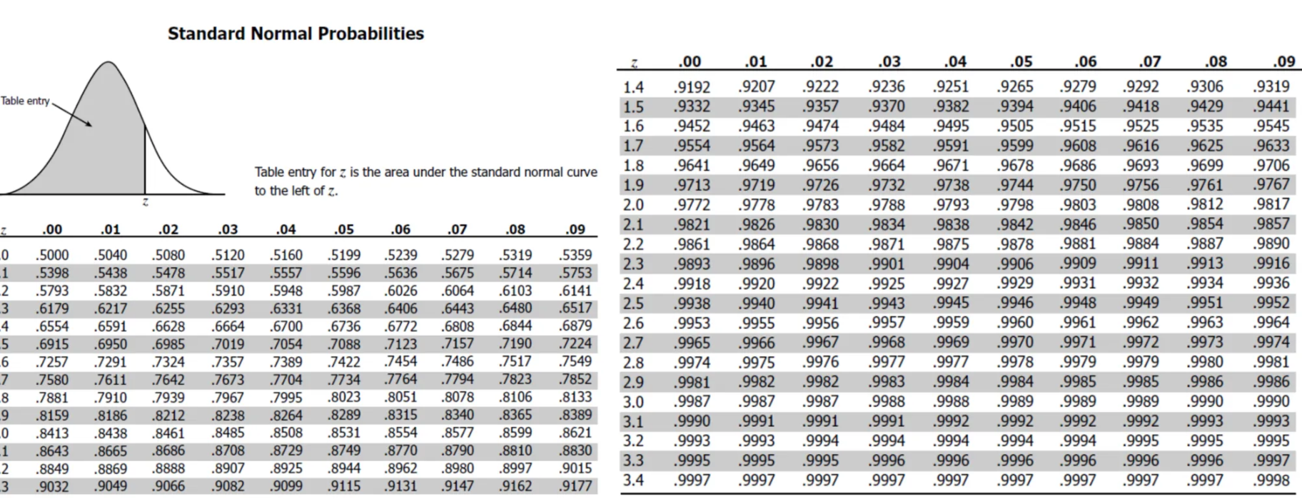 하기 표는 z값의 왼쪽 끝 ( ) 부터 해당하는 z 값까지 "누적된 확률값" 을 제공