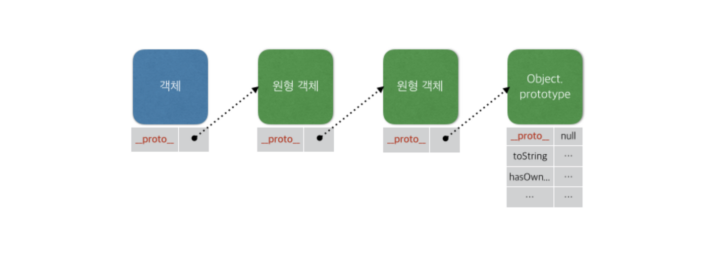 원형 또한 객체이기 때문에 원형은 또 다른 원형을 참조하게 되고 연속된 프로토타입 링크를 통해 최종적으로 Object.prototype 까지 연결된다.