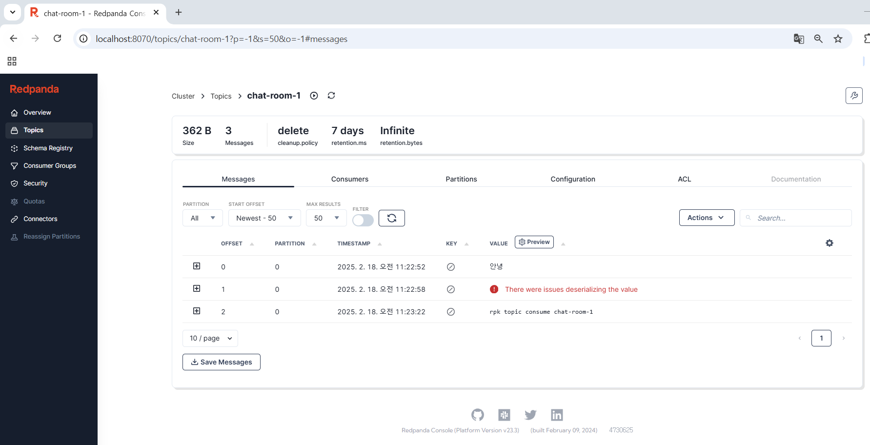 터미널 2 : 토픽 chat-room-1 에 메세지 수신