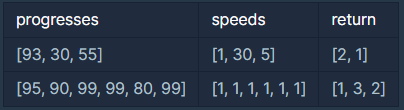 먼저 배포되어야 하는 순서대로 작업의 진도가 적힌 정수 배열 progresses와 각 작업의 개발 속도가 적힌 정수 배열 speeds가 주어질 때 각 배포마다 몇 개의 기능이 배포되는지를 return 하도록 solution 함수를 완성하세요.
