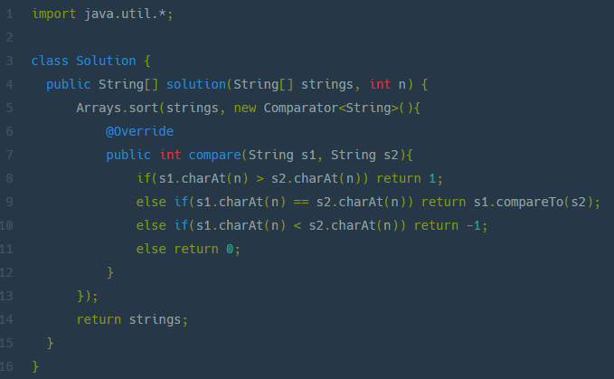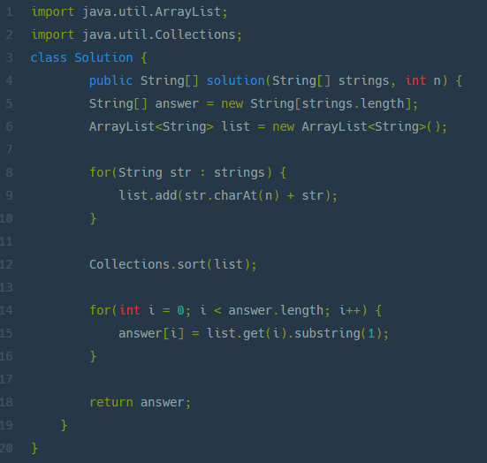 - 인덱스 1의 문자가 같은 문자열이 여럿 일 경우, 사전순으로 앞선 문자열이 앞쪽에 위치합니다.