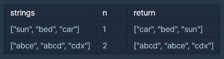 - 모든 strings의 원소의 길이는 n보다 큽니다.