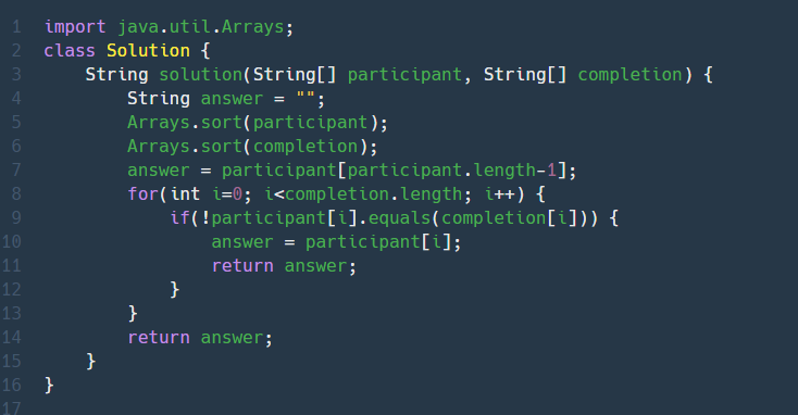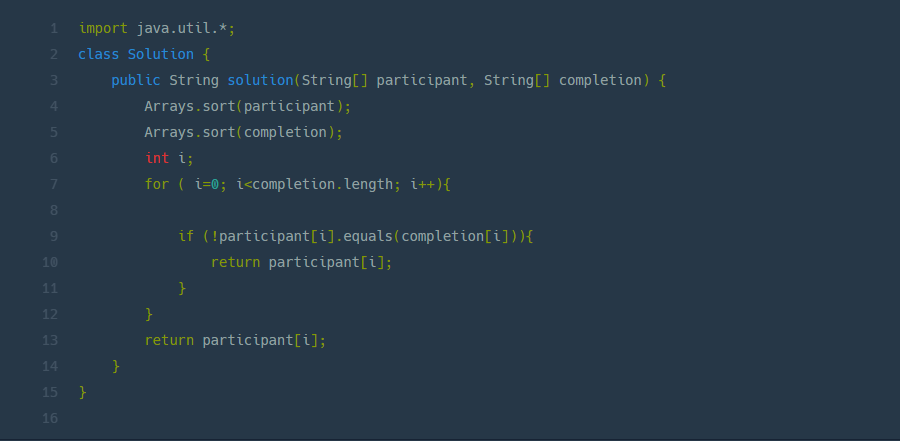 - 참가자와 완주자의 이름을 비교하여 같지 않다면 정답