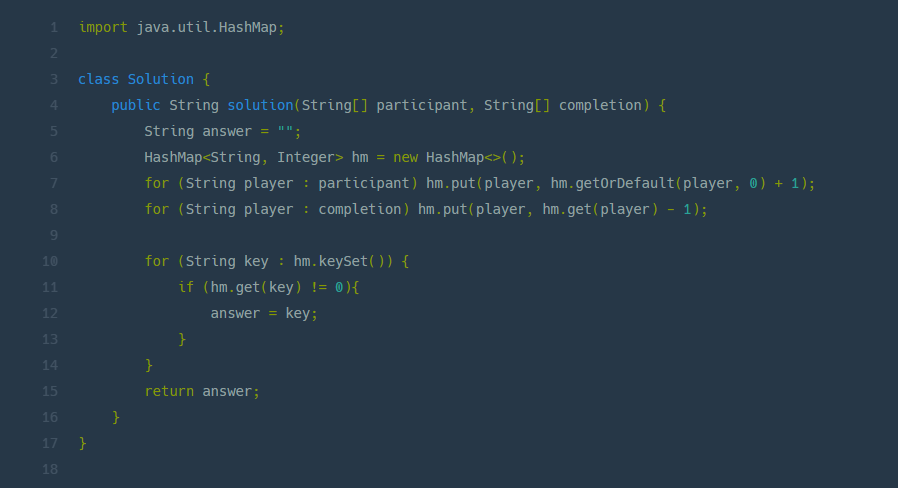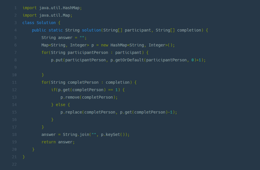 - 모든 코드를 수행 한 후 남아있는 하나의 key값이 바로 완주하지 못한 선수라는 사실을 알 수 있다.