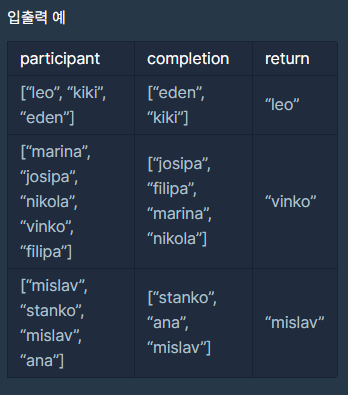 마라톤에 참여한 선수들의 이름이 담긴 배열 participant와 완주한 선수들의 이름이 담긴 배열 completion이 주어질 때, 완주하지 못한 선수의 이름을 return 하도록 solution 함수를 작성해주세요.