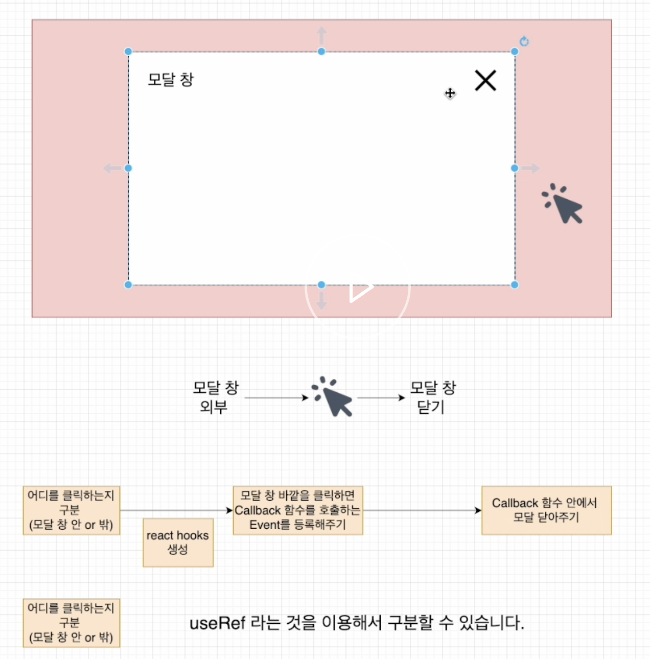 const outSection = useRef(); // 모달창 영역 밖에 해당하는 부분 useRef을 통해 선택