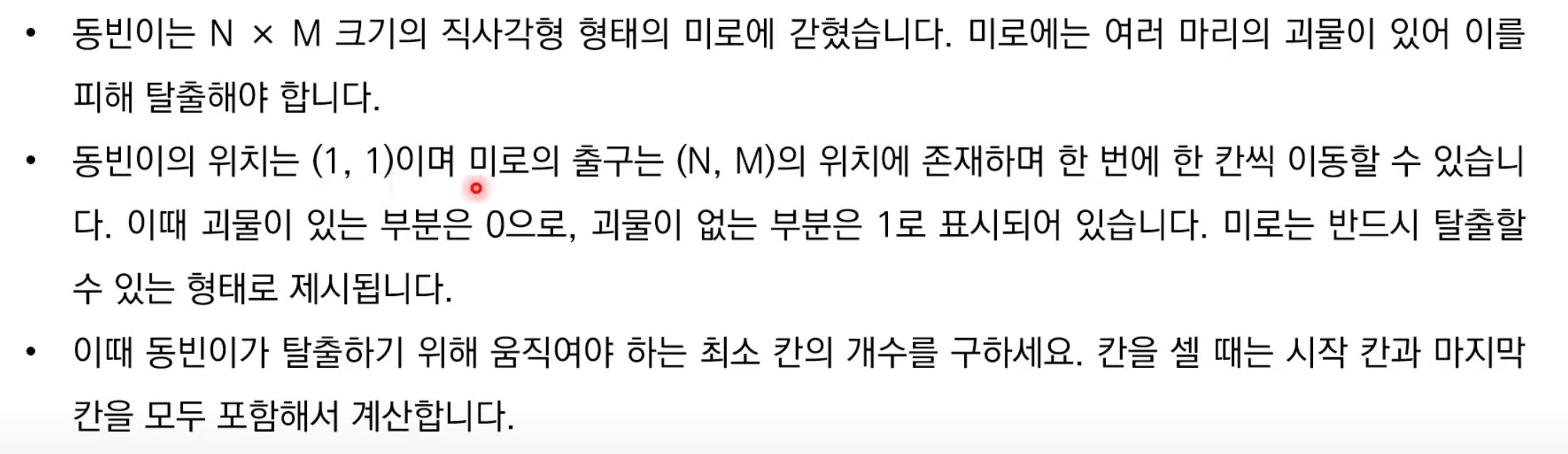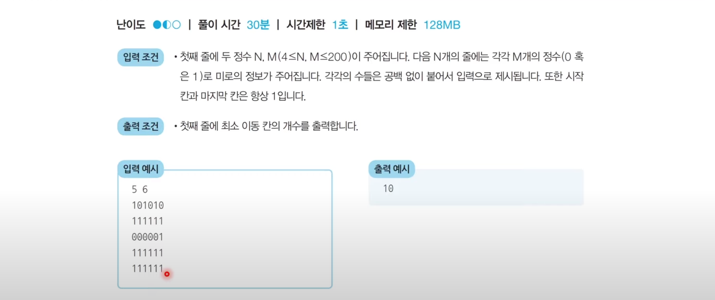 이는 BFS로 1이 들어있는 칸을 이동할때마다 이동횟수로 바꿔주면서 제일 먼저 원하는 위치에 도착했을때의 횟수를 출력해주면 되는 문제일것같다.