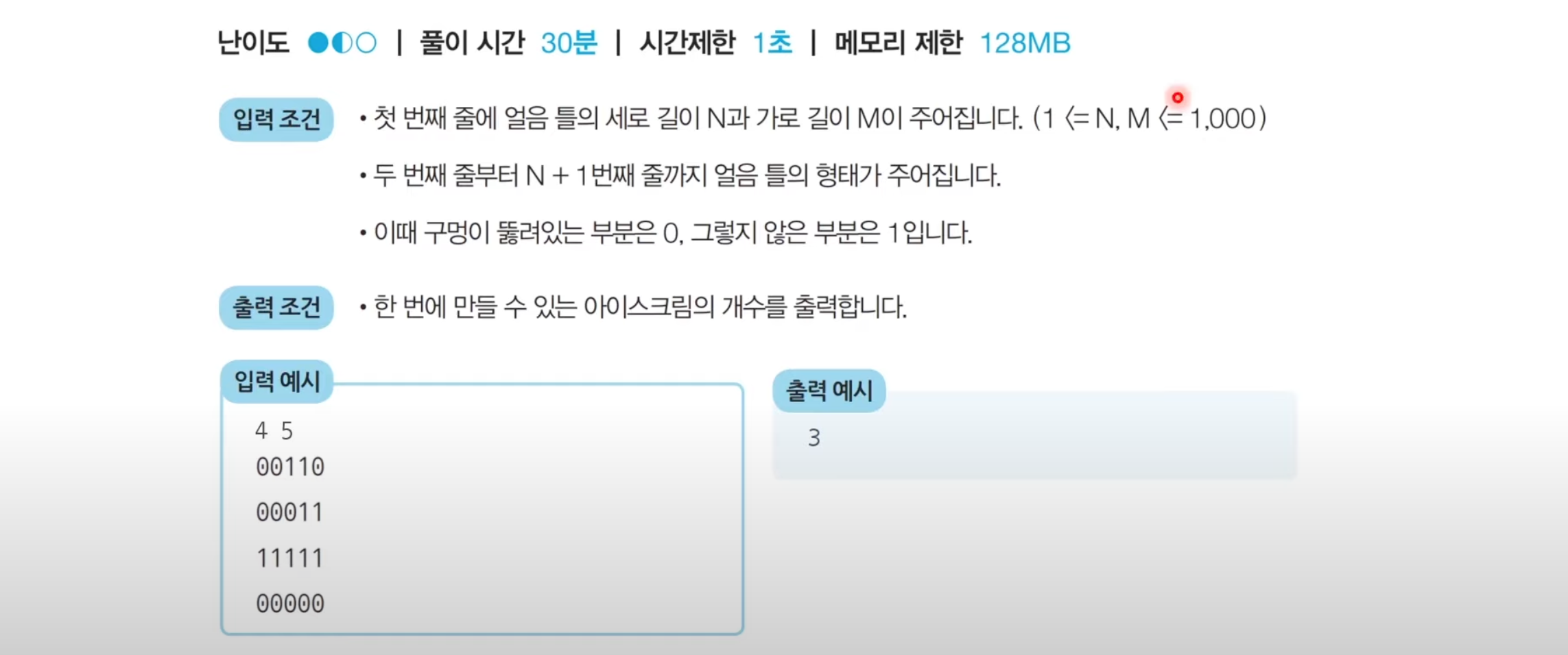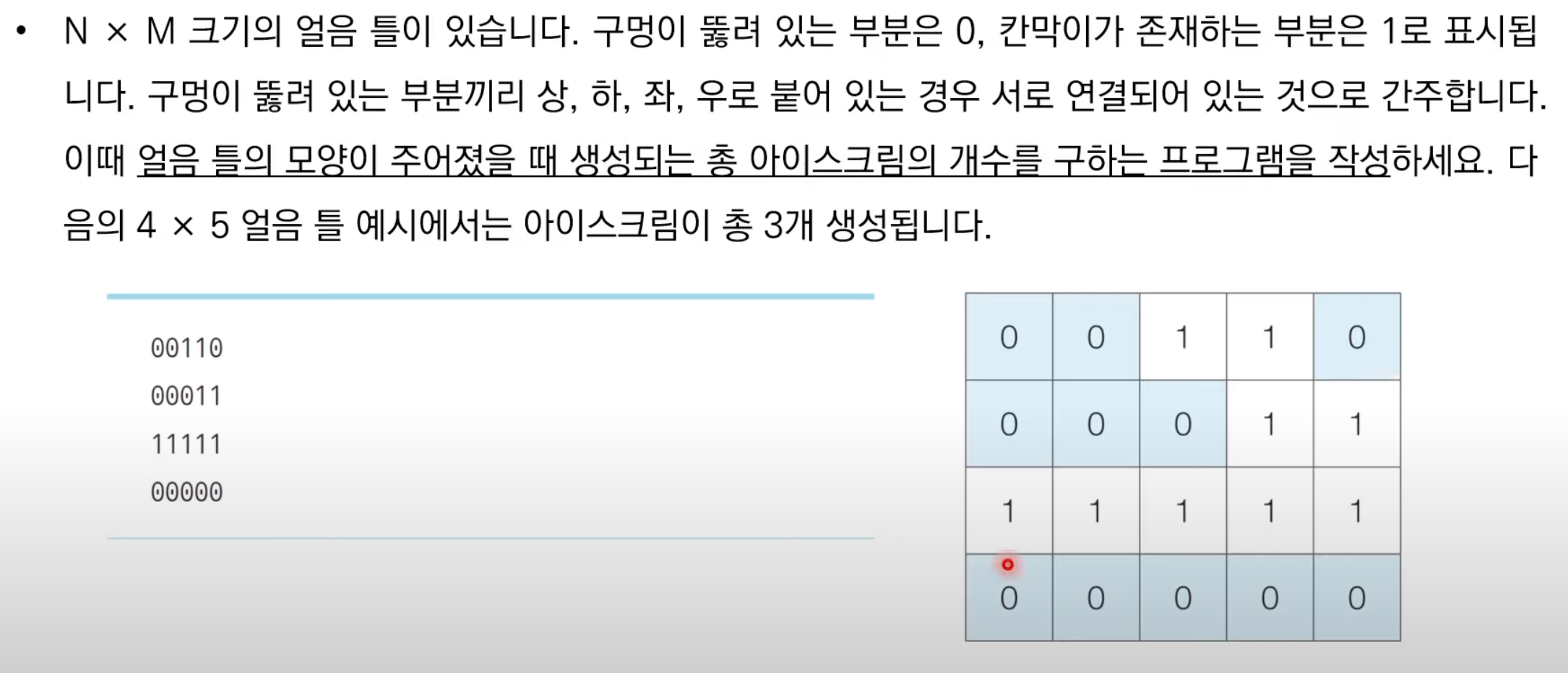def dfs(x,y): if x<=-1 or x>=n or y<=-1 or y>=m: return False if graph[x][y]==0: #0 인근 0 노드 1로 변경 graph[x][y]=1 dfs(x-1,y) dfs(x+1,y) dfs(x,y-1) dfs(x,y+1) return True return False n,m = map(int,input().split()) graph=[] for i in range(n): graph.append(list(map(int,input()))) cnt = 0 for i in range(n): for j in range(m): if dfs(n,m)==True: cnt+=1 print(cnt)
