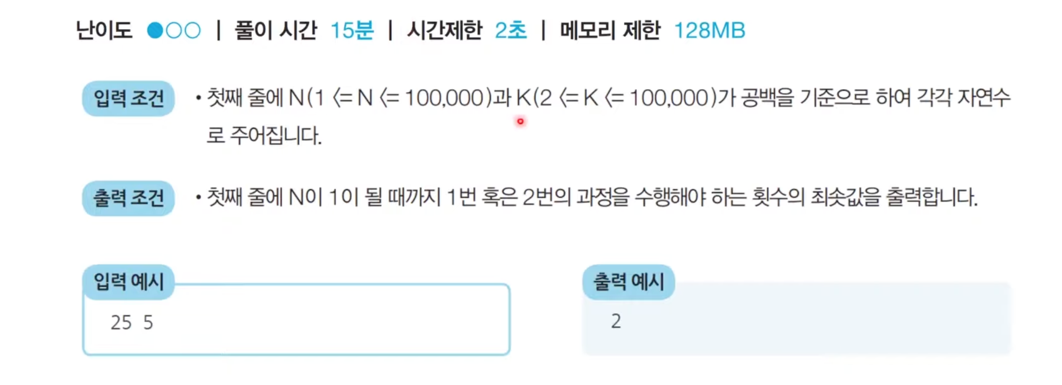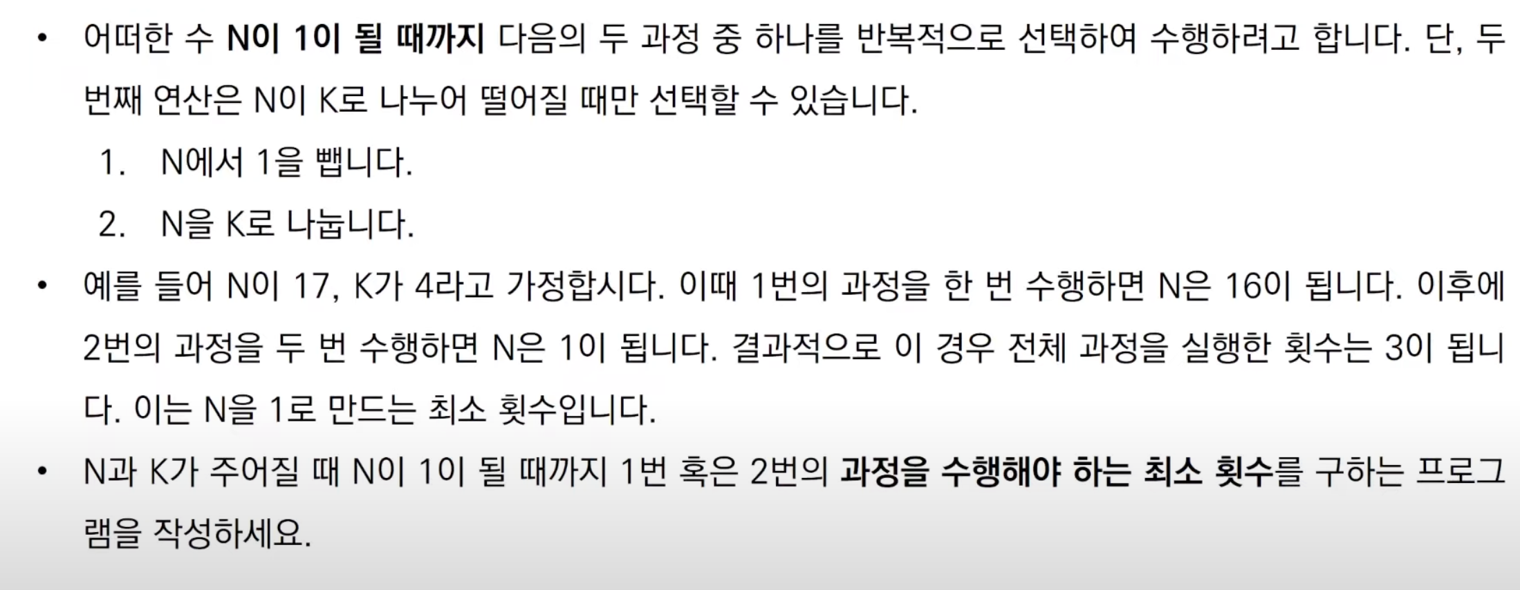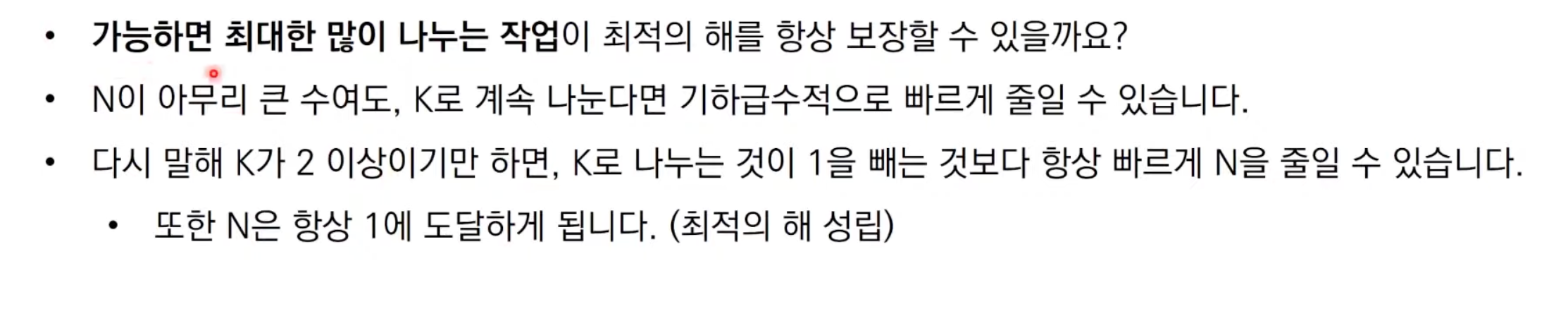 나누기를 하는 케이스가 빼기를 하는 케이스보다 더 최소의 cnt를 가지게 할것이니 k의 배수일때 나눌수 있으면 나누고 못나누면 빼기를 해줘서 k의 배수까지 가게하는 방법을 찾으면 될것이라 생각한다.