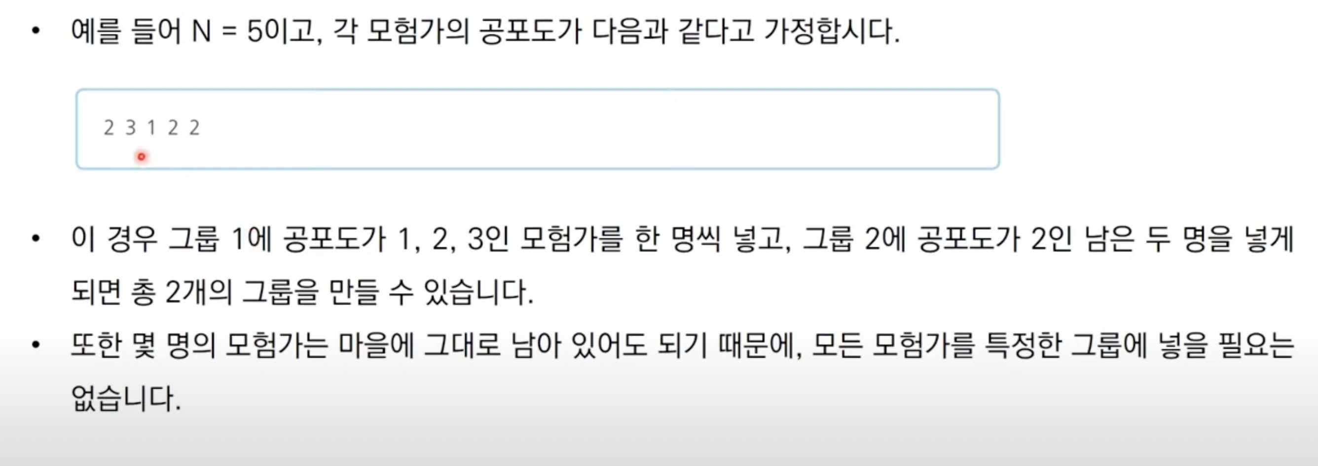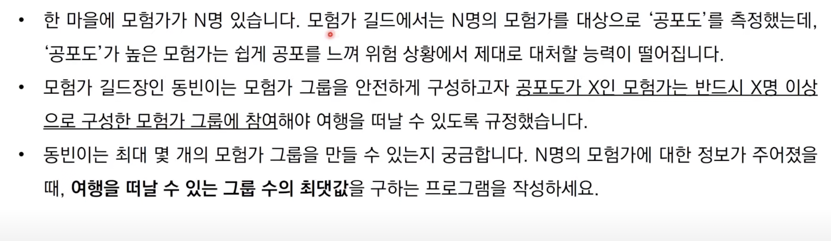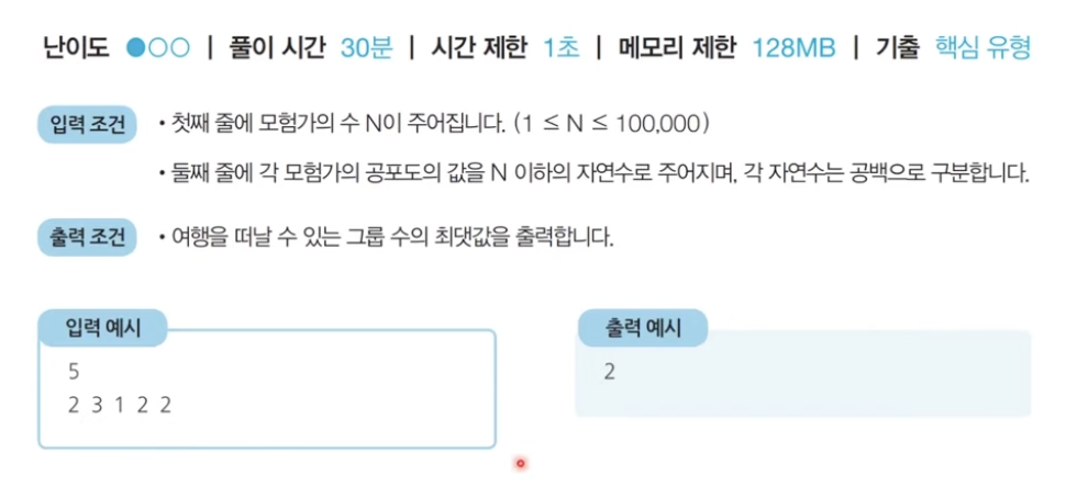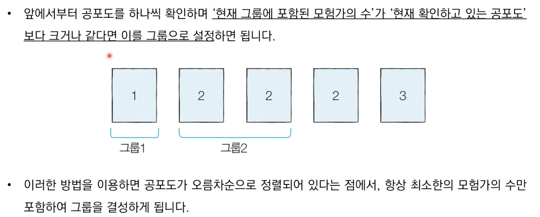 정렬을 진행하고 앞에서부터 공포도를 체크하며 그룹을 만들어 나가면 될것이다.