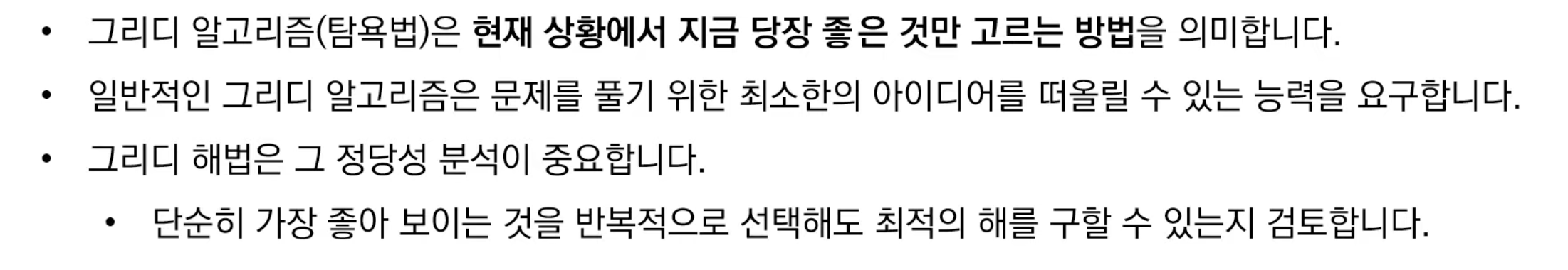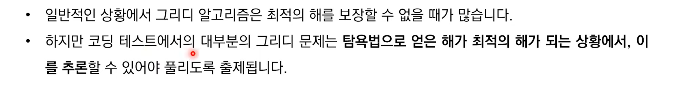 코테에서 나오는 그리디 문제들은 탐욕법으로 나오는 해가 답인 케이스라고 생각해야한다 !