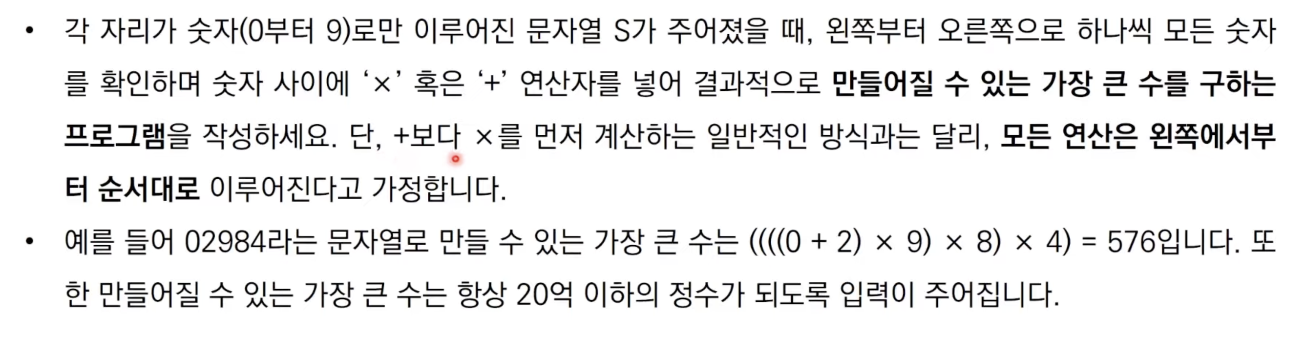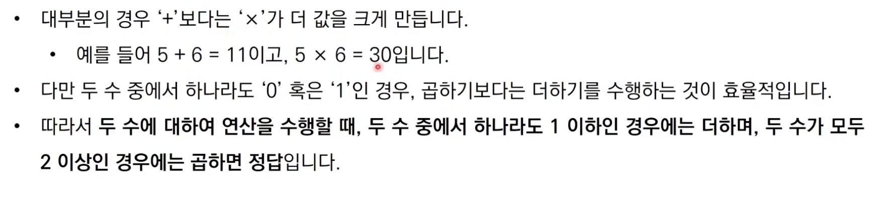 아마.. 더하기 보다는 곱하기가 큰데 0이나 1이 오는 경우에는 곱하기보다 더하기가 더 큰 값을 가지게 하니 0,1일때만을 예외로 더하기로 하고 그외에는 곱하기 과정을 해주면 될것같다.