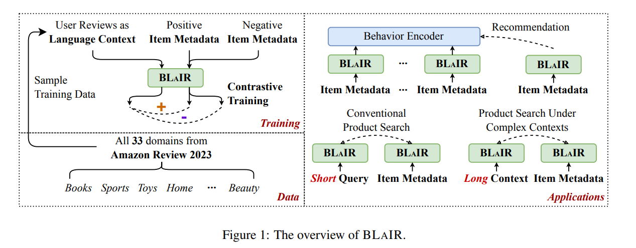 retreiving과 item 추천을 잘하는 language context와 item meta data의 correleation을 학습하는 BLAIR wpdks