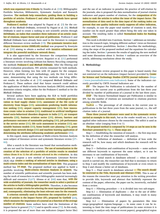 Pagani et al은 이 Proknow-C를 바탕으로 Methodi Ordination 방법을 개발하였는데, 이방법은 논문의 인용수, 저널의 영향력, 출판 연도를 고려하는 InOrdination 지수를 사용해 논문의 순위를 정한다. Proknow-C와 Methodi Ordinatio는 서로 다른 방법론을 비교하는 데에도 활용된다.