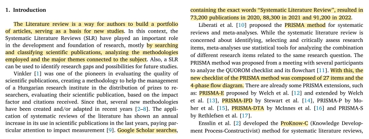 Literature Review는 연구자가 새로운 연구의 기초가 되는 논문의 포트폴리오를 구축하는 방법으로, Systematic Literature Review (체계적 문헌 리뷰)는 연구의 발전과 기반 마련에 중요한 역할을 하고, 과학 출판물을 수집, 분류하고, 사용된 방법론과 주제를 분석하는데 활용된다. 더불어, SLR은 연구의 gaps와 향후 연구 가능성을 식별하는데에도 사용된다.