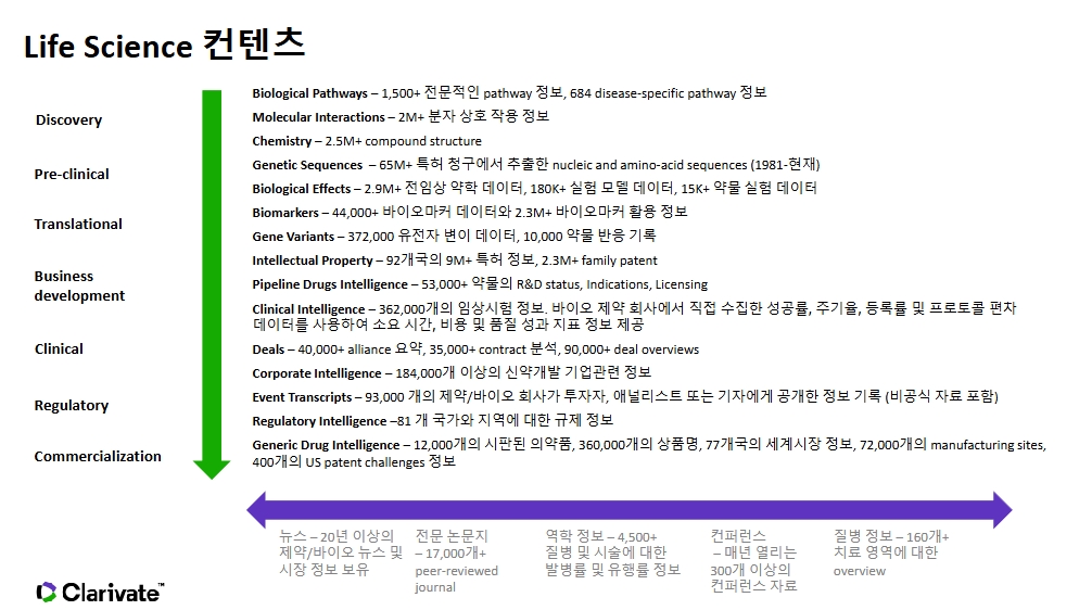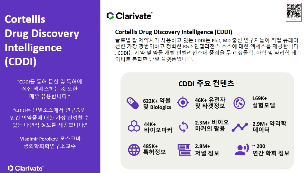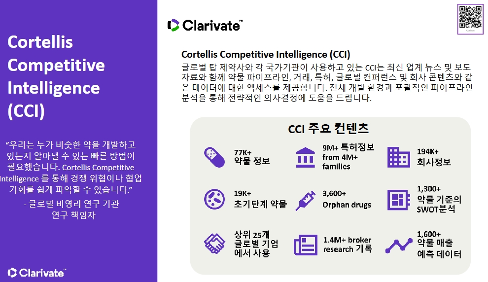 약물들에 대한 모든 정보를 모아둔 제품으로 제품의 Sales forecast, 질환에 대한 시장정보, 특허, 거래, 임상, SWOT 분석 등의 종합적인 정보를 제공