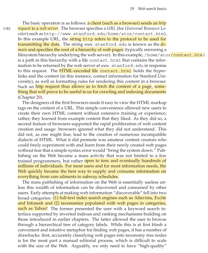 기본적인 작동방식은 다음과 같다. 클라이언트(브라우저)는 웹서버에 http 요청을 보낸다. 그러면 브라우저는 URL(Universal Resource Locator)를 받는데 예를들어, http://www.stanford.edu/home/atoz/contact.html. 이 된다. 여기서 예를든 URL의 string http는 데이터를 전송하기 위한 통신 프로토콜에 해당된다. 그리고 string에 해당하는 www.stanford.edu는 도메인에 해당하는 부분이며 웹페이지의 계층을 정의하게 된다. /home/atoz/contact.html은 이 계층에서의 경로가 되는데, 웹서버인 www.standford.edu의 요청에 대한 응답에 대한 정보들이 파일 contact.html에 저장되어 있다고 생각하면된다.