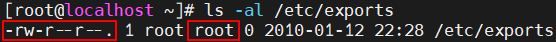 "/etc/exports" 파일 소유자가 "root", 권한이 644(-rw-r--r--)로 설정되어 있는 상태입니다.
