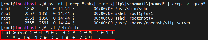 | 취약 | 서버 및 Telnet, FTP, SMTP, DNS 서비스에 로그온 메시지가 설정되어 있지 않은 경우 |