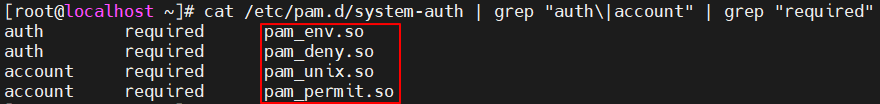 패스워드 잠금 임계 값 관련 "auth", "account" 설정 값에 기본 모듈만 설정되어 있고, 잠금 임계 값, 잠금 해제 시간이 설정되어 있지 않은 상태입니다.