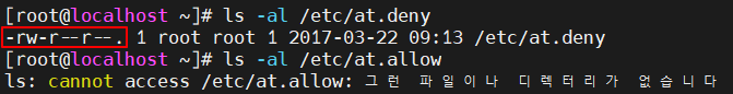 "/etc/at.allow" 파일이 존재하지 않지만, "/etc/at.deny" 파일의 권한이 644(-rw-r--r--)로 설정되어 있는 상태입니다.