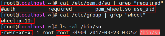 "/etc/pam.d/su" 파일 내 "su" 관련 설정이 주석으로 처리되어 있고, "wheel" 그룹에 사용자가 추가되어 있지 않으며, "/bin/su" 그룹 소유자 "root", 권한이 4755(-rwsr-xr-x)로 설정되어 있는 상태입니다.