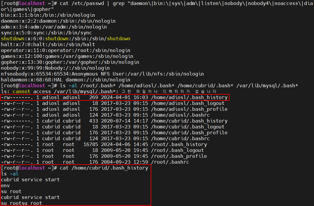 시스템 계정이 로그인 할 수 없도록 Shell이 제한되어 있지만, WEB 서버 관리 계정으로 사용하고 있는 "adiosl" 계정이 로그인한 흔적을 확인할 수 없어 불필요하게 Shell이 설정되어 있는 상태입니다.
