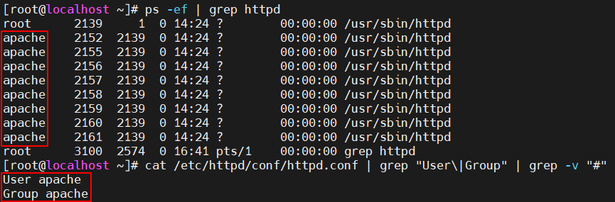 "Apache" 데몬이 활성화되어 있으며, "/etc/httpd/conf/httpd.conf" 파일 내 "Users", "Group" 값이 "apache"로 설정되어 있는 상태입니다.