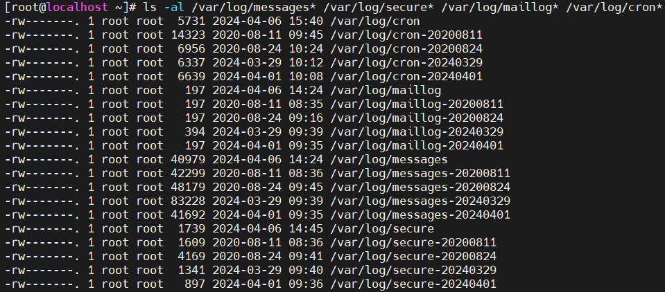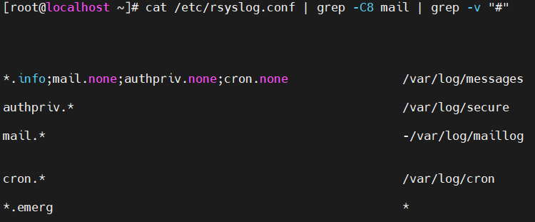 "su 로그" 및 "시스템 로그"에 대해 ".authpriv", ".info, mail, cron, emerg" 모두 정상적으로 기록하고 있는 상태입니다.