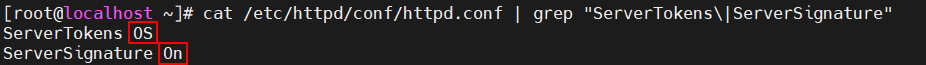 "/etc/http/conf/httpd.conf" 파일 내 "ServerTokens" 값이 "OS", "ServerSignature" 값이 "On"으로 설정되어 있는 상태입니다.