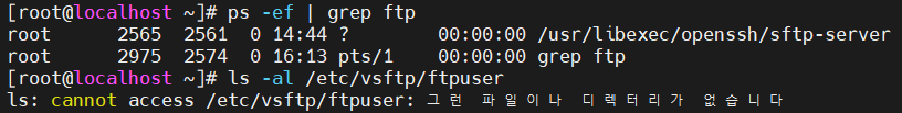 "FTP" 데몬이 비활성화되어 있고, FTP 사용자 접근 통제 설정 파일(ftpusers)이 존재하지 않는 상태입니다.