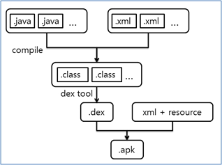 • Encoded XML file : *.xml 파일은 바이너리로 되어있기 때문에 그냥 실행하면 내용을 알아보기가 어렵다. 전용 툴로 디컴파일해야 볼 수 있다.