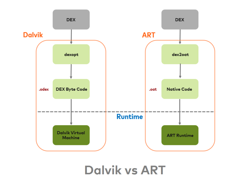 • ART와 Dalvik은 Dalvik bytecode를 실행하는 호환되는 런타임 환경