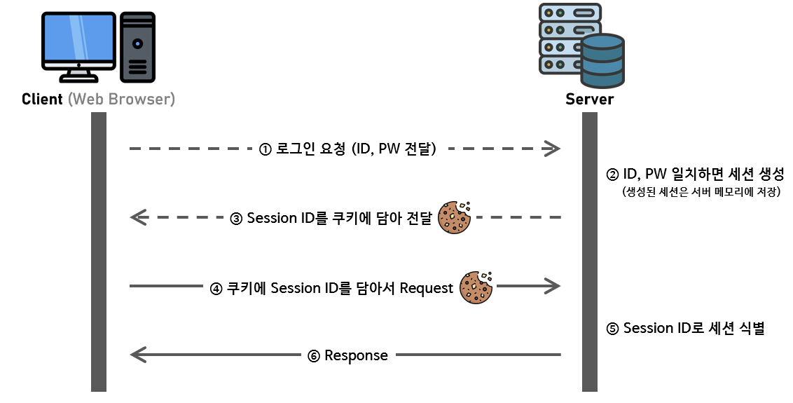 => 클라이언트는 서버에 요청을 전송할 때 마다 할당 받은 세션 ID로 인증