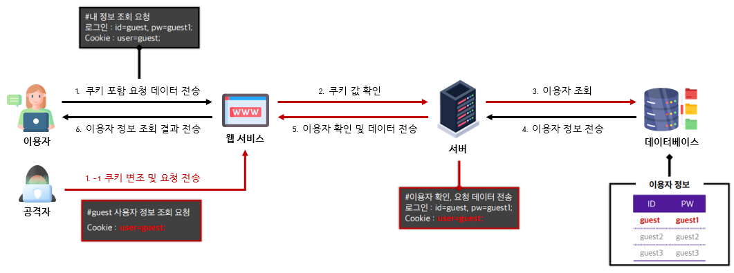 쿠키 변조를 통해, 서버에 요청 전송해 임의 이용자 정보 탈취