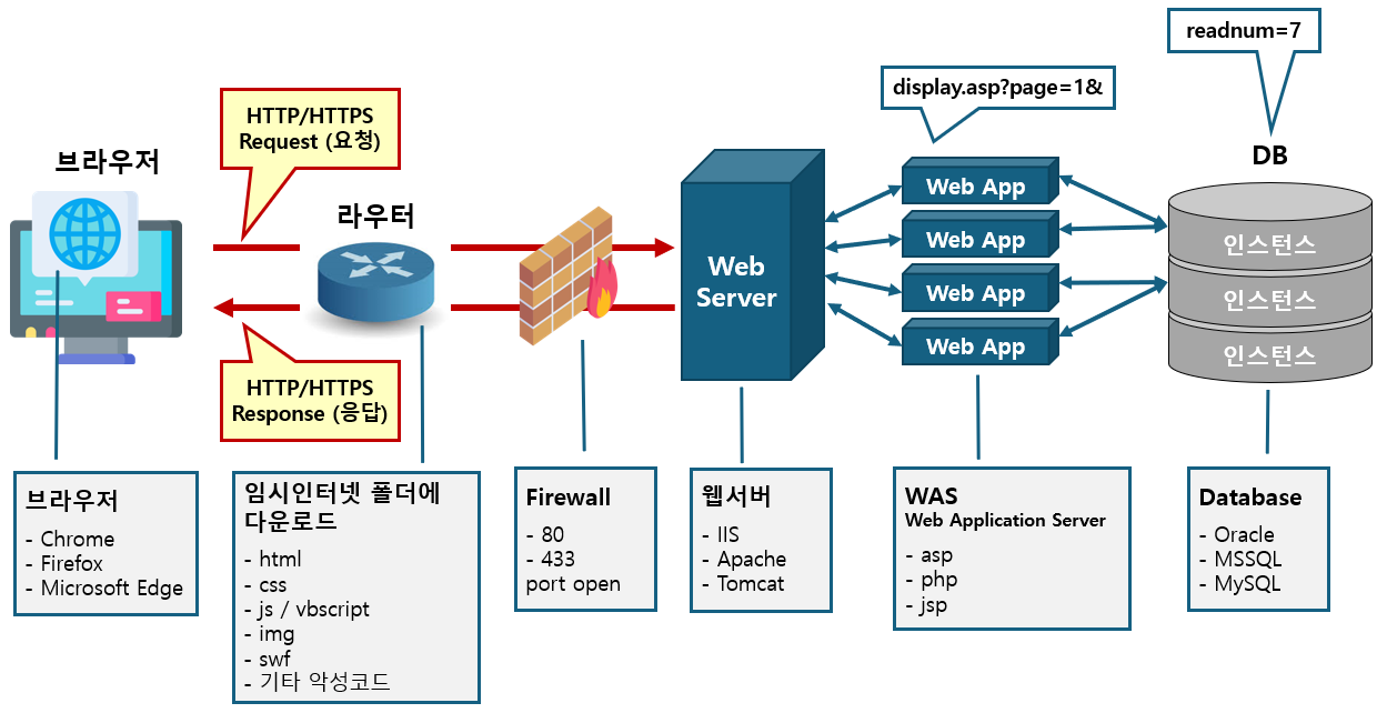 ⑤ 웹 서버는 바로 웹 페이지를 공급하지 못하고, 웹 애플리케이션 서버와 데이터 베이스에서 웹 페이지 작업을 처리한다.