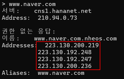 nslookup네임서버 아래에 있는 정보를 바탕으로 도메인 서버를 받고 ip정보 조회